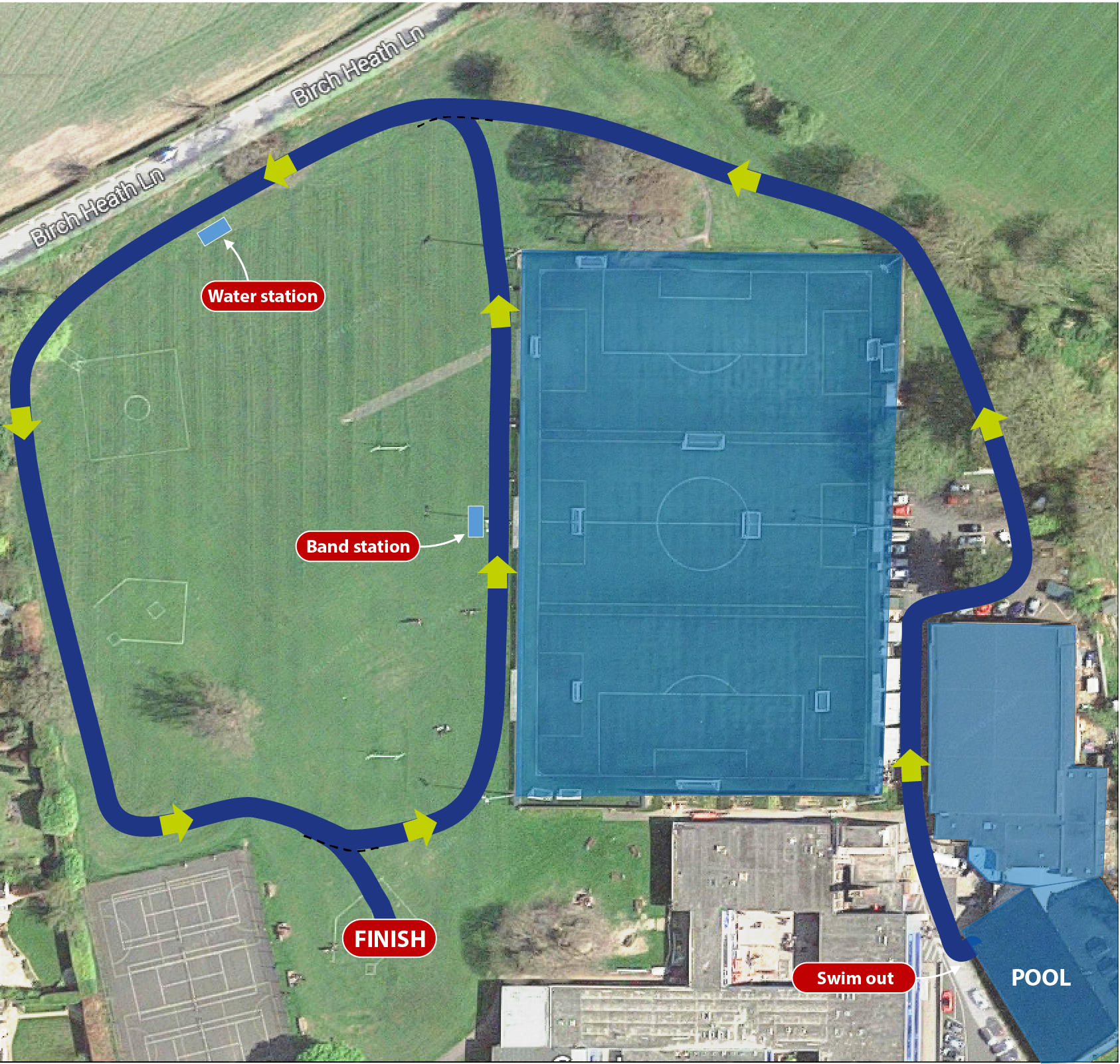 When you have completed your swim, climb out of the pool and put on your running kit at the side of the pool. Leave through the doors at the top of the pool and follow the directions for the run course. Please shout out your number as you leave the pool area.