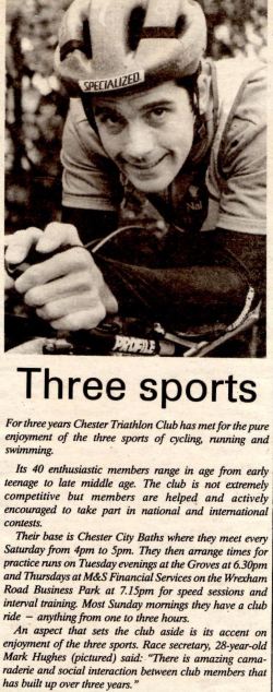 The City of Chester Triathlon Club was formed in 1994 by Sam Titman, Mike Foran and Sioran Glanrid-Jones. Back then the club had no coaches, no officials and very few members. Club finances were meagre, and triathlons cost £10 to £15!